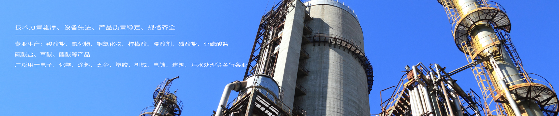 主要產(chǎn)品有:羧酸鹽、氯化物、銅氧化物、檸檬酸、浸酸劑、磷酸鹽、亞硫酸鹽、硫酸鹽、草酸、醋酸等,廣泛用于電子、化學(xué)、涂料、五金、塑膠、機(jī)械、電鍍、建筑、污水處理等各行各業(yè)。